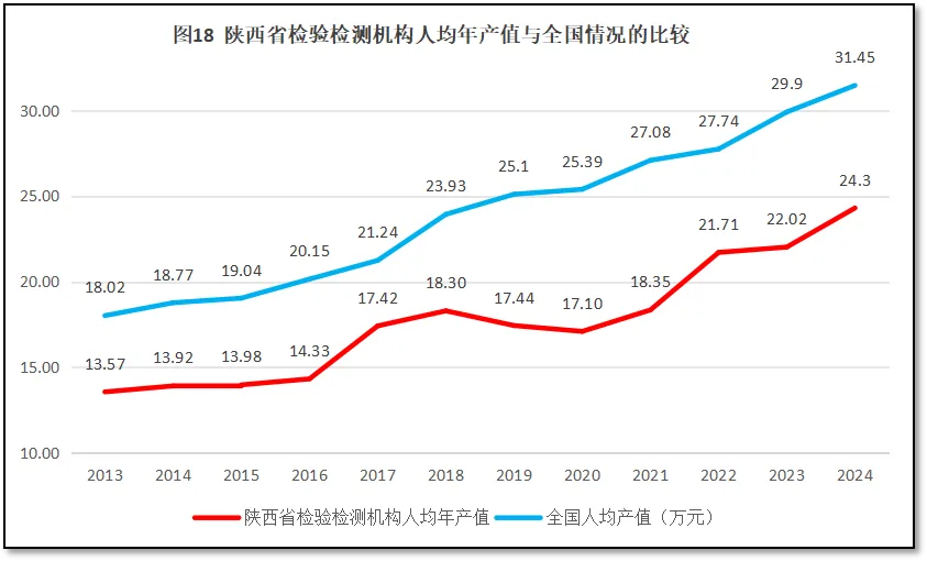陕西省检验检测机构人均年产值与全国的情况比较,如图18所示。